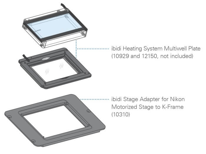 ibidi Stage Adapter for Nikon Ti2-S-SE-E and Ti2-S-SS-E Motorized Stage to K-Frame – Preassembled: Mounting frame for Nikon Ti2-S-SE-E and Ti2-S-SS-E Motorized Stages to fit the ibidi Heating System Multiwell Plate – Silver Line; preassembled to the Heated Plate of the Incubation Chamber when ordered together with 12150 |